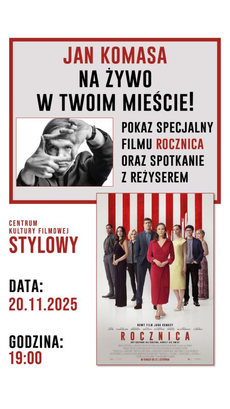 Centrum Kultury Filmowej „Stylowy” w Zamościu zaprasza na przedpremierowy pokaz filmu ROCZNICA oraz spotkanie z JANEM KOMASĄ, reżyserem „Miasta 44”, „Sali samobójców”, a także nominowanego do Oscara „Bożego Ciała”. Wydarzenia odbędzie się 20 listopada 2025 o godz. 19:00 w zamojskim kinie.
